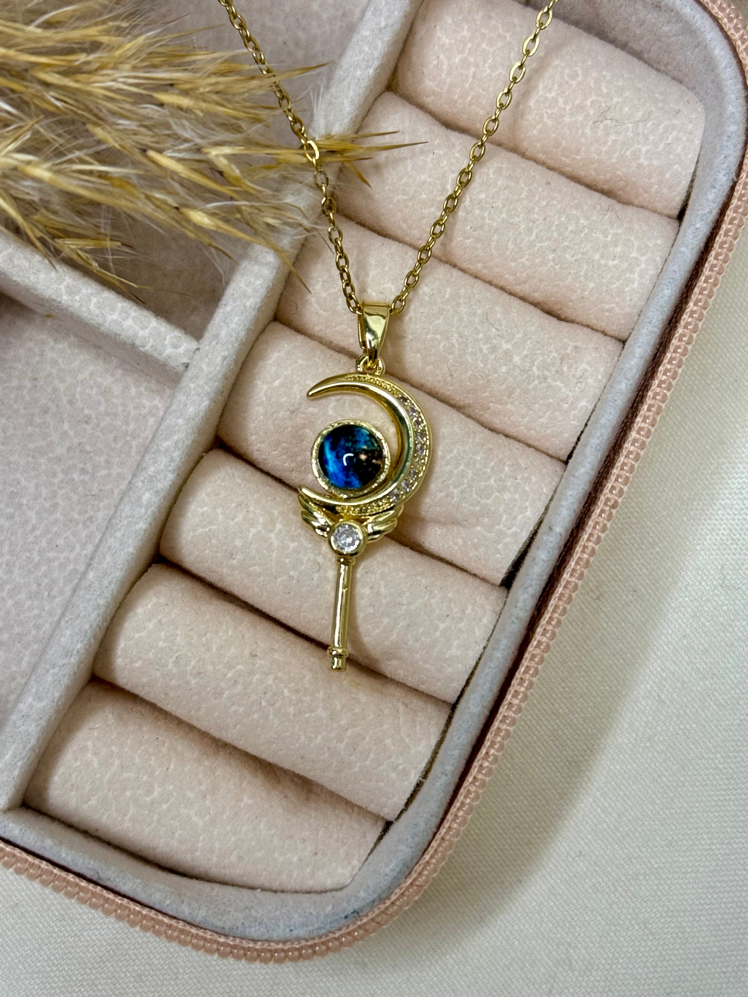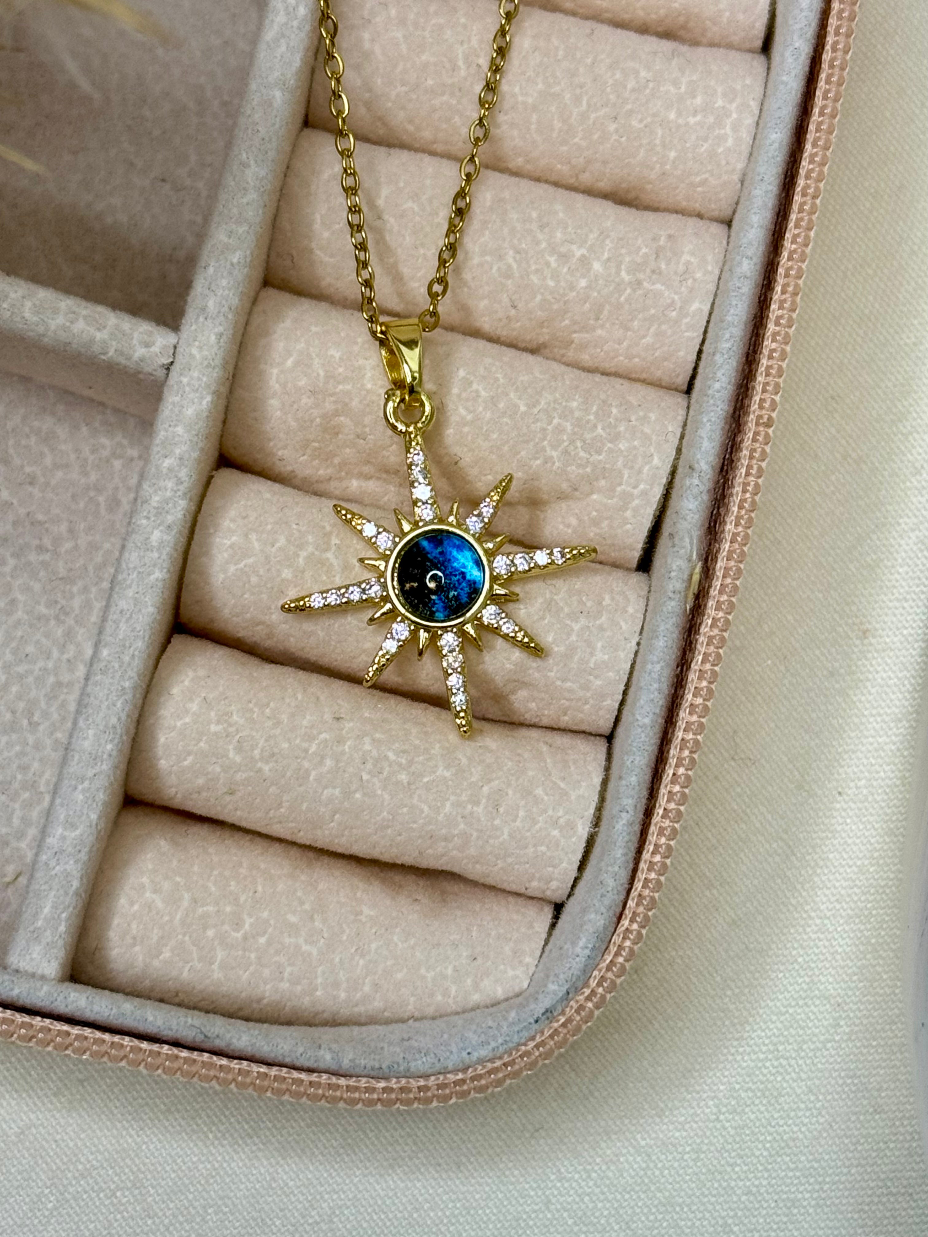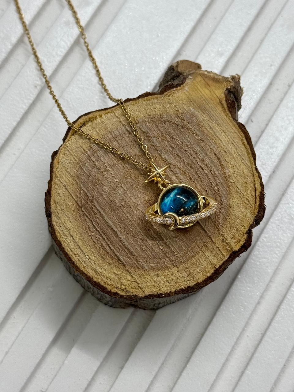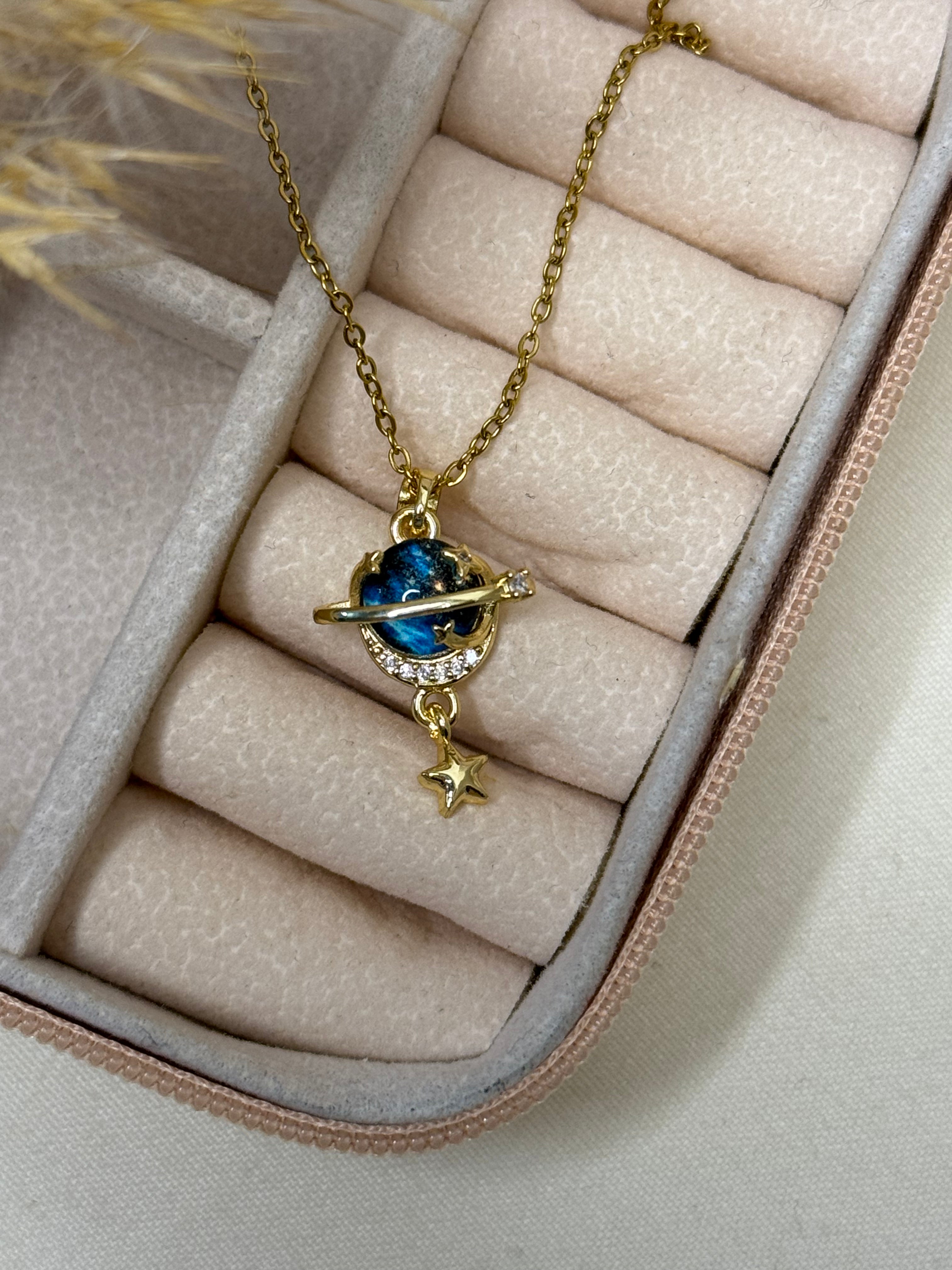 Dive into the magic of the cosmos with this stunning Planet Galaxy Necklace. Featuring a brilliant blue planet orbited by a crystal-studded ring and a tiny star charm, this piece adds a whimsical, celestial touch to any outfit.
