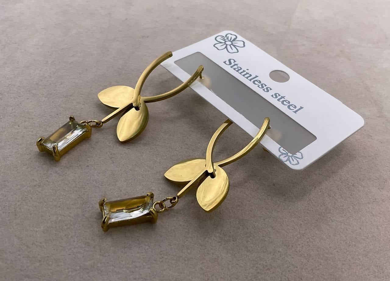 Design: A modern botanical-inspired arch design with dual gold-tone leaves, finished with a single dangling rectangular crystal
